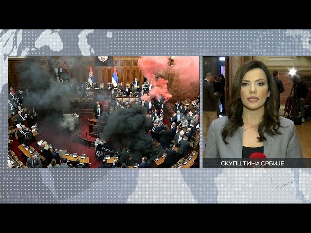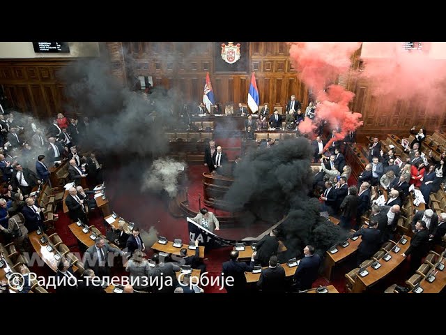 В задымленном зале кто-то облил водой спикера парламента Ану Брнабич, а затем между депутатами началась потасовка. Брнабич объявила с трибуны, что парламент продолжит работу и пригласила депутатов вернуться на свои места.