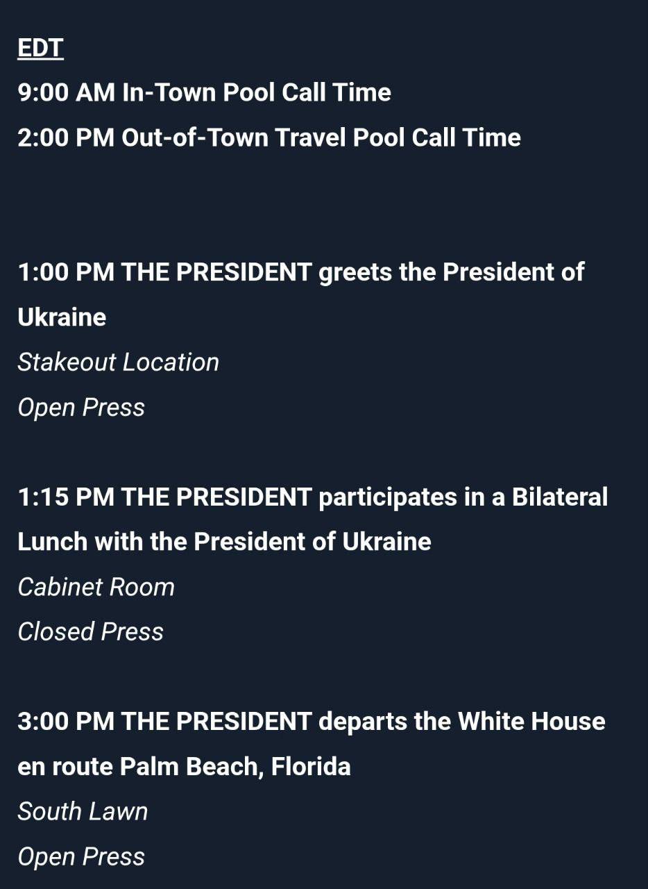 Согласно данным Белого дома, переговоры пройдут в неформальной обстановке за обедом и будут закрыты для прессы. После встречи Дональд Трамп направится во Флориду.
