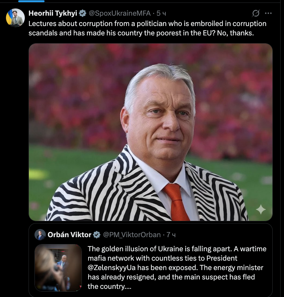Но в Министерстве иностранных дел Украины подготовили ответ на заявление Орбана и напомнили венгерскому политику о его коррупционных скандалах из прошлого. "Лекции о коррупции от политика, который впутан в коррупционные скандалы и сделал свою страну самой бедной в ЕС? Нет, спасибо", - заявил спикер украинского МИД Георгий Тихий.