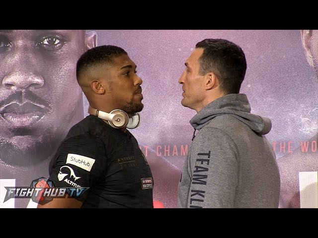 Владимир Кличко и Энтони Джошуа встретились в Лондоне на финальной пресс-конференции накануне встречи на ринге. Общение прошло в очень спокойной атмосфере - боксеры неоднократно и ранее повторяли, что гордятся тем, что не скатились до взаимных оскорблений и смогли продать 90 тысяч билетов на свой бой без грязного пиара.