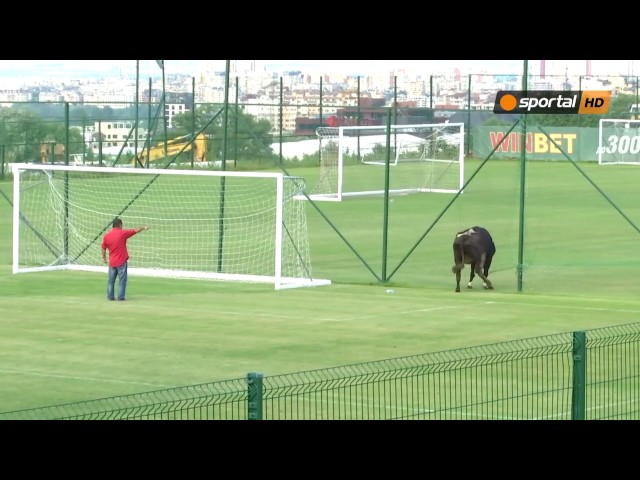 В Болгарии на товарищеском матче между местным "Ботевом" кипрским АЕЛом на футбольном поле внезапно появилась корова. Животное никого не трогало и пошло себе вдоль по газону. Видео инцидента появилось на канале "Sportal.bg".