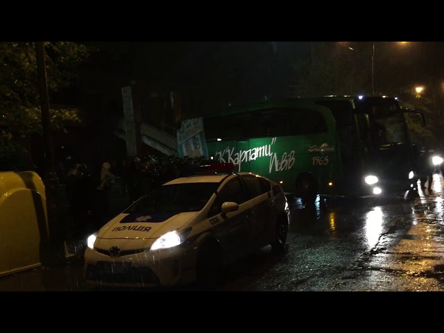 Автобус, в котором прибыли в Франковск игроки "Карпат", приняли в кольцо бойцы Нацгвардии и полицейские. В портале подчеркнули, что правоохранителей было очень много. Они были в бронежилетах и с резиновыми дубинками.