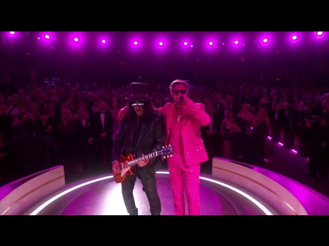 Не менш яскравою подією вечора був виступ номінанта Раяна Гослінга з піснею I'm Just Ken, яку він записав для фільму "Барбі". Артист з'явився на сцені в розшитому стразами рожевому костюмі та рукавичках і змусив танцювати та підспівувати увесь зал. Завершити номер йому допомагали колеги з фільму "Барбі": режисер Грета Гревіг, акторки Марго Роббі та Америка Феррера.