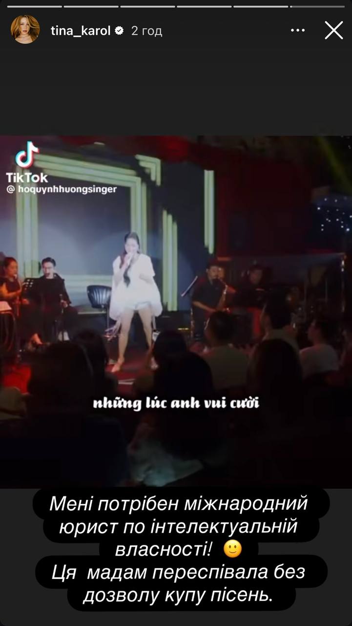 Співачка Тіна Кароль готується подати до суду проти в'єтнамської співачки за незаконне виконання її хітів. У сториз Instagram артистка зазначила, що наразі перебуває в пошуку міжнародного юриста з інтелектуальної власності, який займеться цим питанням.