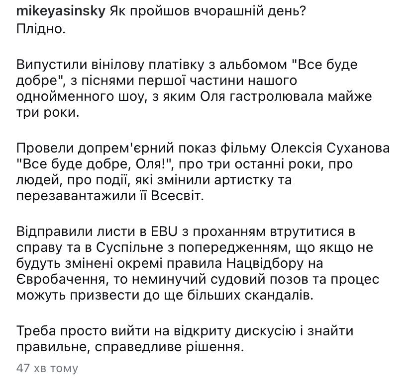 Продюсер Олі Полякової Михайло Ясинський разом із командою співачки звернувся до Європейського мовного союзу (EBU) з проханням закликати "Суспільне" до перегляду правил українського нацвідбору. Про це він повідомив у соцмережах.