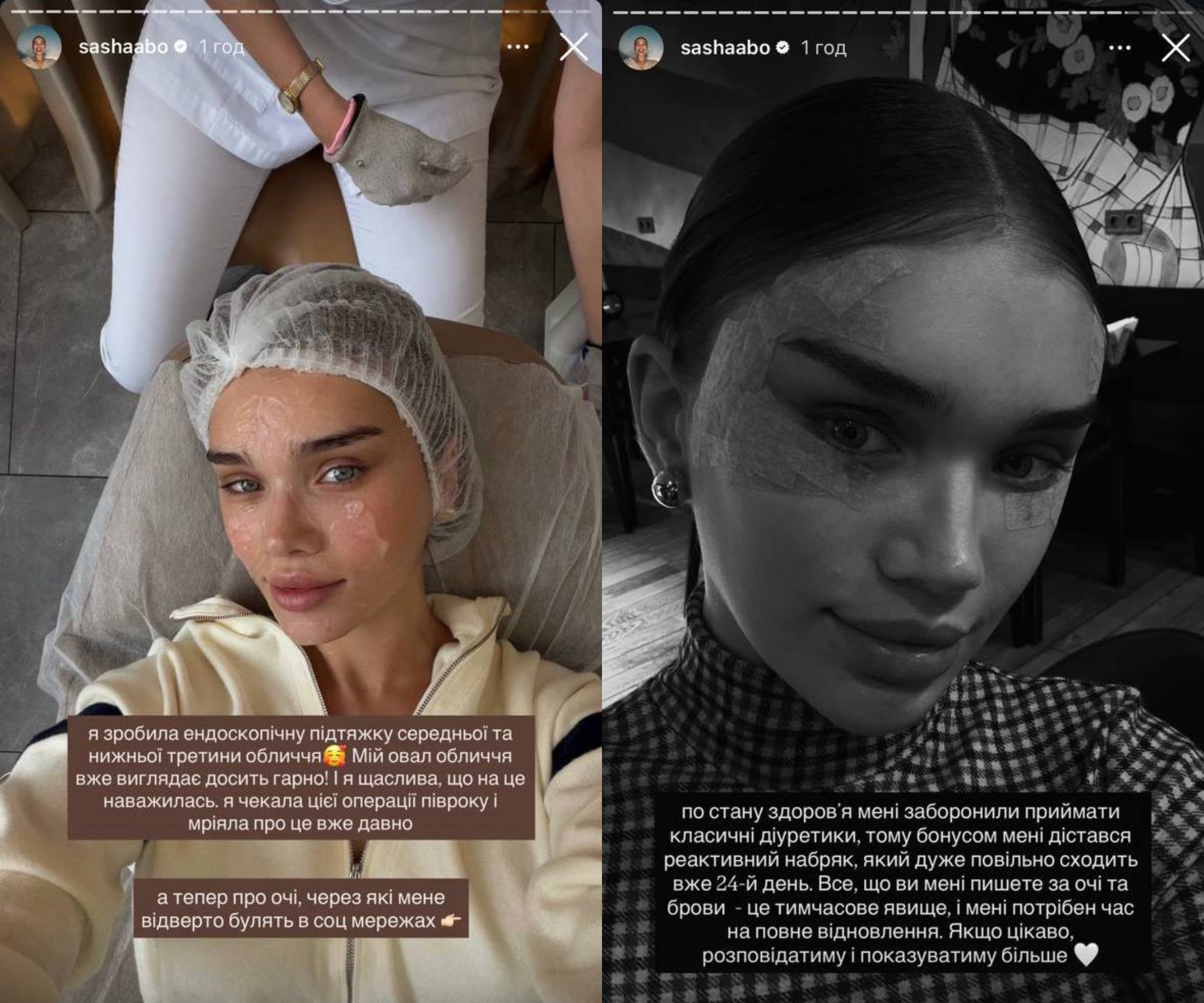 Інстаблогер Саша Бо зробила пластичну операцію на обличчі. Інфлюенсер зробила ендоскопічну підтяжку середньої та нижньої третини обличчя. Про це вона повідомила у сторіс Instagram. За словами блогера, вона готувалася до операції протягом пів року і майже місяць тому було проведено хірургічне втручання.