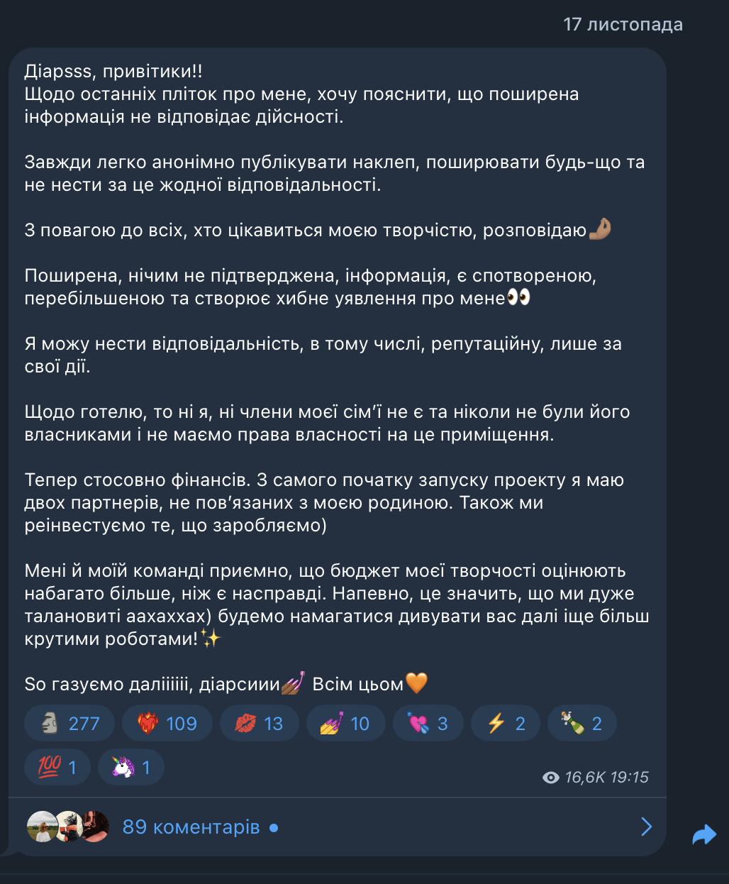 - Поширена, нічим не підтверджена, інформація, є спотвореною, перебільшеною та створює хибне уявлення про мене. Я можу нести відповідальність, в тому числі репутаційну, лише за свої дії... Тепер стосовно фінансів. З самого початку запуску проекту я маю двох партнерів, не пов’язаних з моєю родиною. Також ми реінвестуємо те, що заробляємо, - написала Grisana.