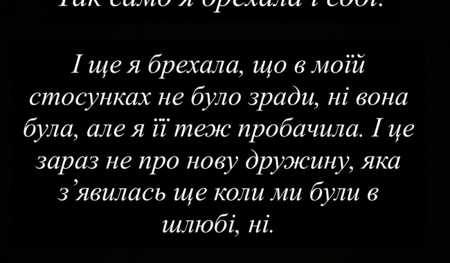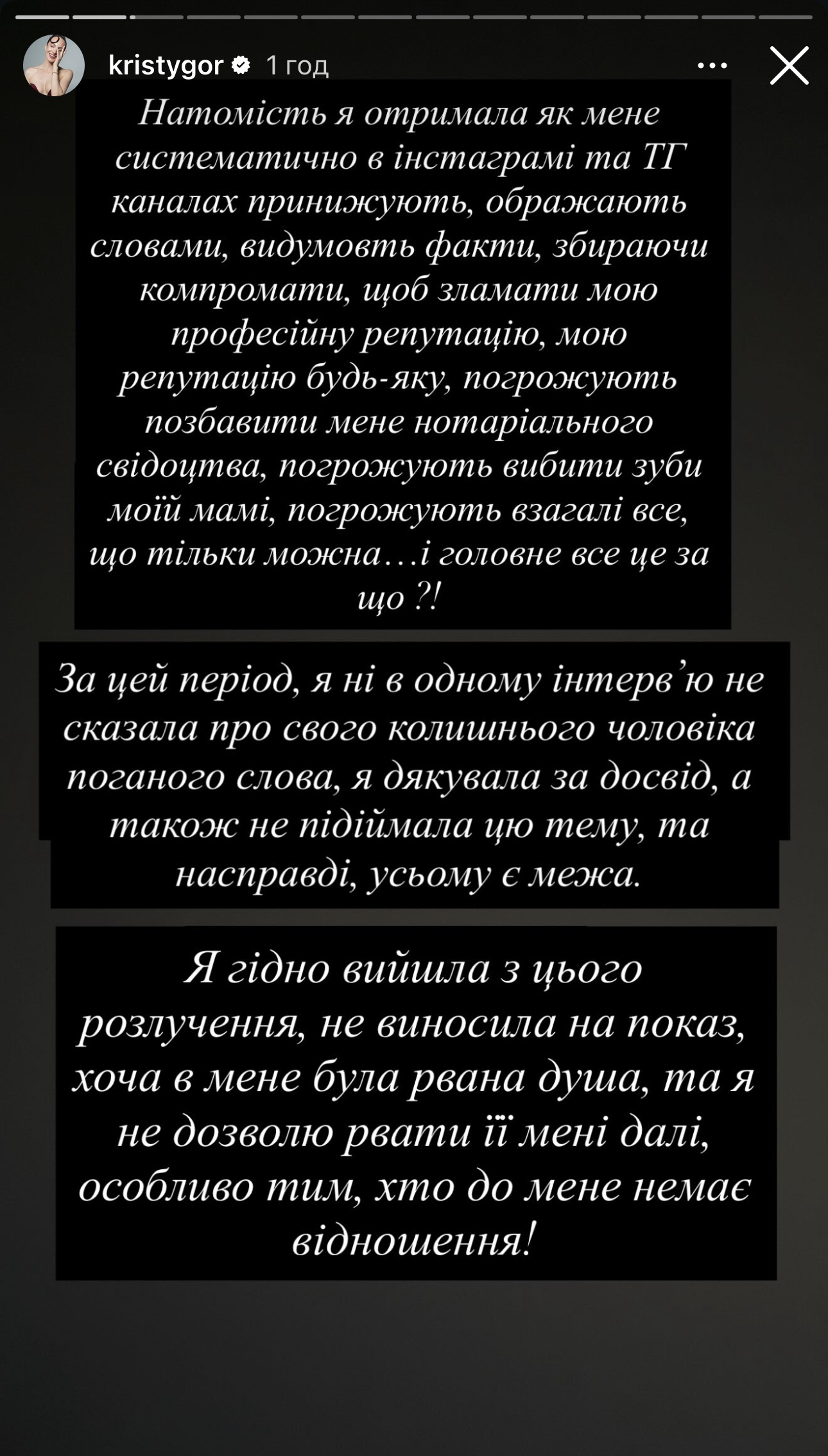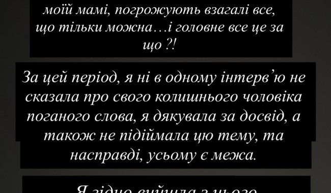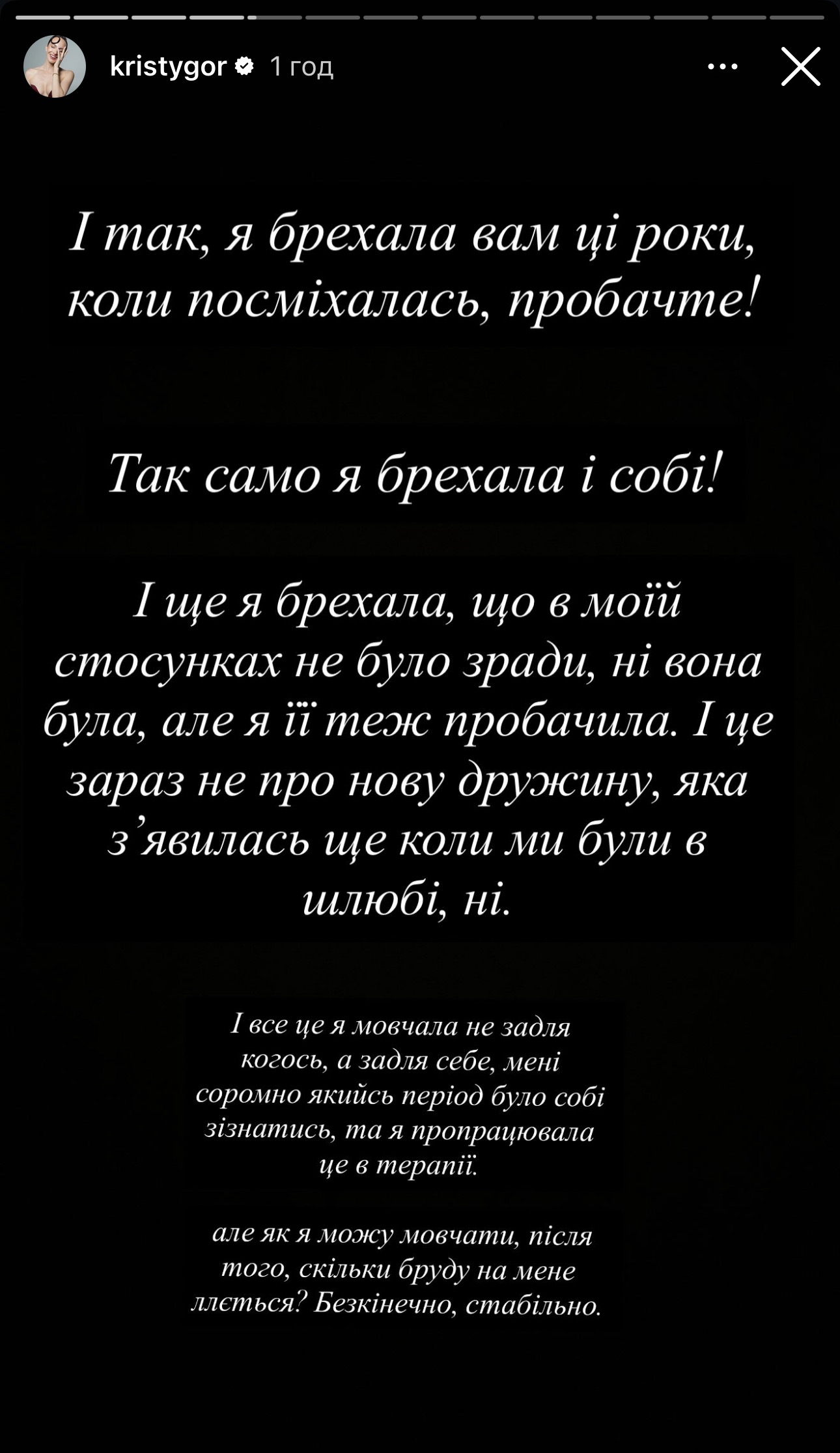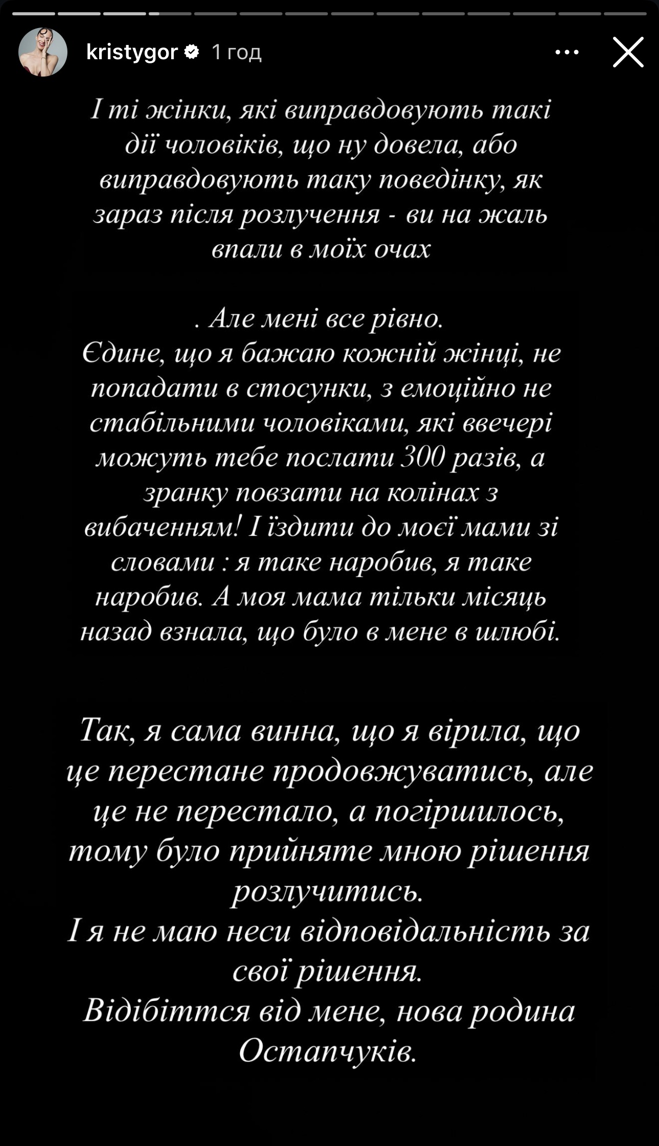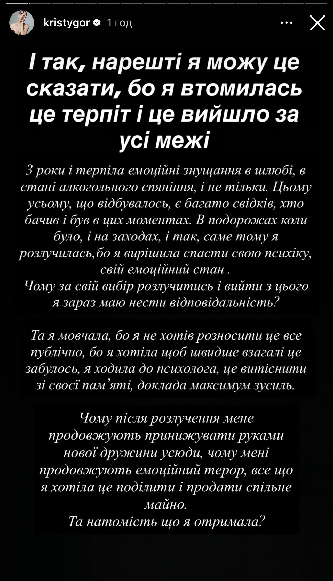 - Три роки я терпіла емоційні знущання в шлюбі, в стані алкогольного сп’яніння, і не лише. Цьому усьому, що відбувалось, є багато свідків, хто бачив і був у цих моментах. У подорожах траплялося, і на заходах, і так, саме тому я розлучилась, бо я вирішила врятувати свою психіку, свій емоційний стан, - написала Горняк.