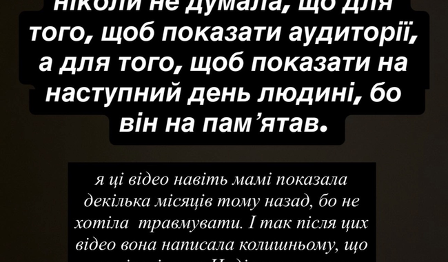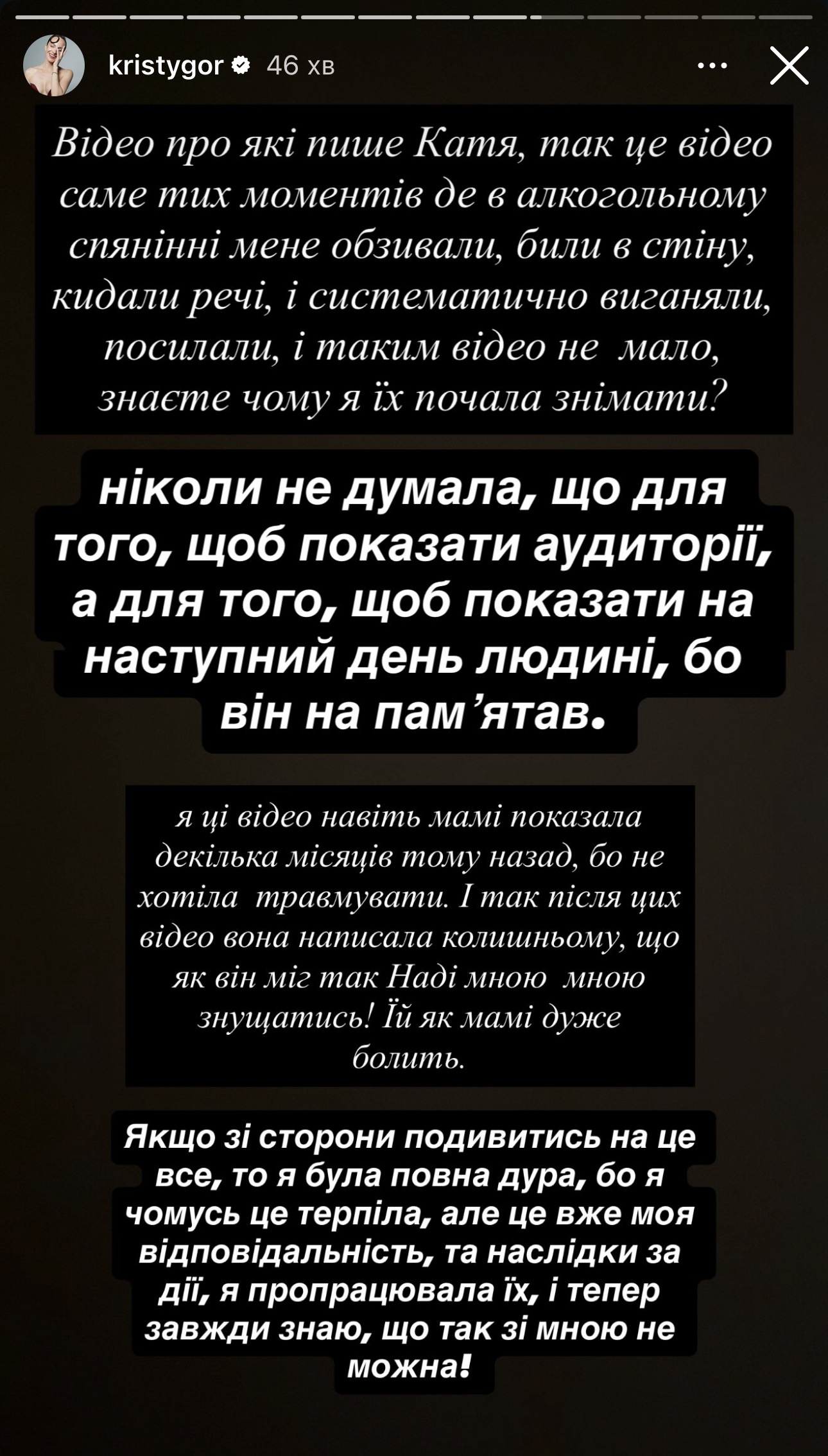 - ...Це відео саме тих моментів, де в алкогольному спʼянінні мене обзивали, били в стіну, кидали речі і систематично виганяли, посилали, і таких відео чимало. Знаєте, чому я їх почала знімати? Ніколи не думала, що задля того, щоб показати аудиторії, а для того, щоб показати наступного дня людині, бо він не памʼятав, - розповіла Горняк.