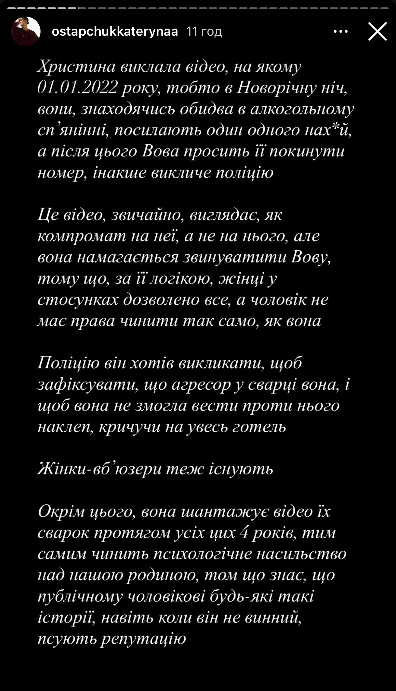 Нинішня дружина Остапчука Катерина заявила, що аб'юзером у стосунках була саме Христина.