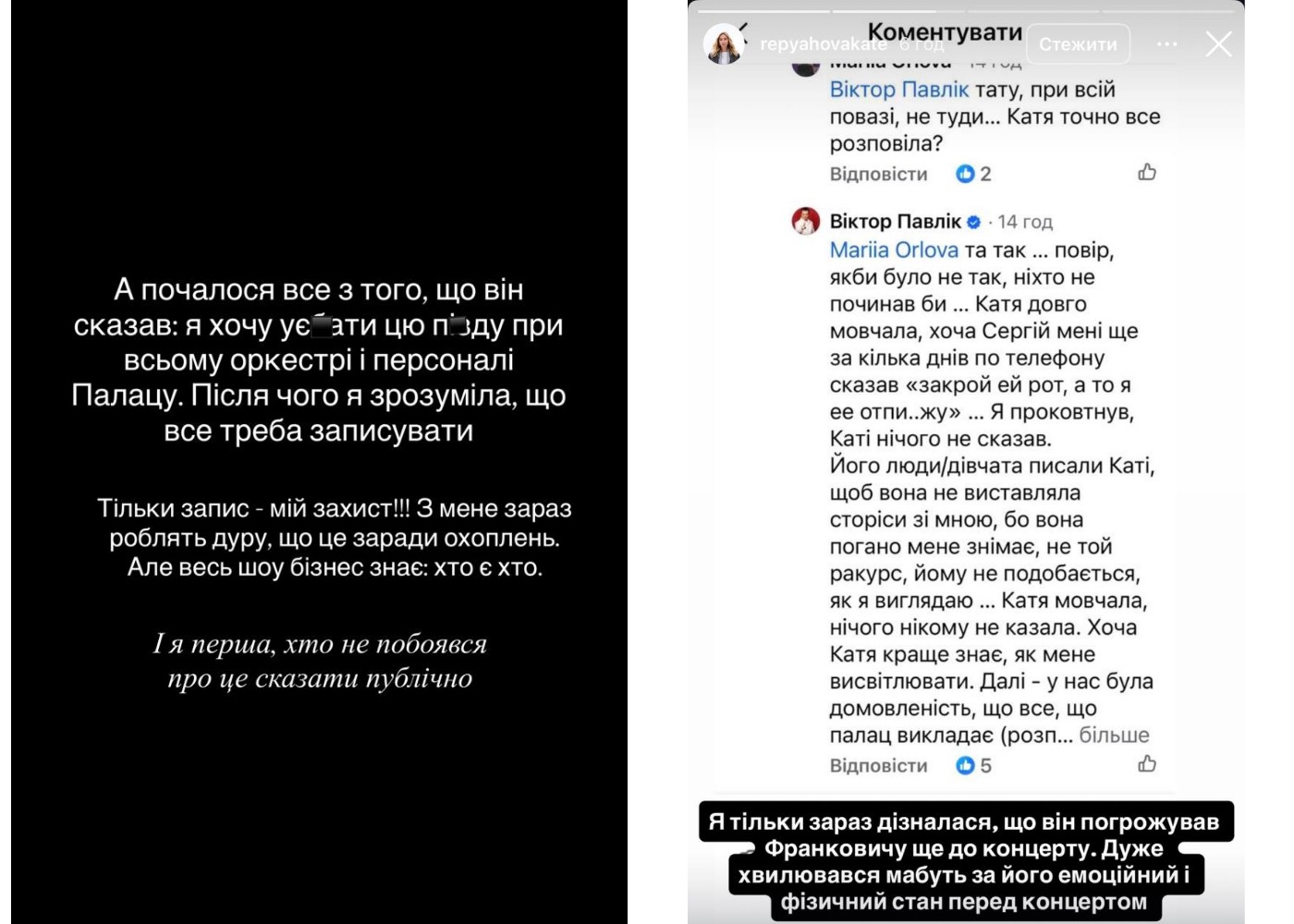 - Ну це якась беспрецедентна історія, якщо чесно. Я не можу за роки досвіду подібного пригадати. Я так розумію, що концертна директорка Віктора Павліка намагалася проникнути в усі творчі процеси підготовки концерту, що дуже заважало. Але тут така історія: якби це був концертний директор Джо Кокера чи Кріса Рі - ці артисти неодноразово виступали на сцені ПУ - то до них би, звичайно, дослухалася вся команда, включаючи Сергія Пермана. Бо це професіонали з багаторічним досвідом роботи в світовому шоу-бізнесі. Але у Катерини Репʼяхової такого досвіду точно немає як і розуміння того, що таке професійна етика.