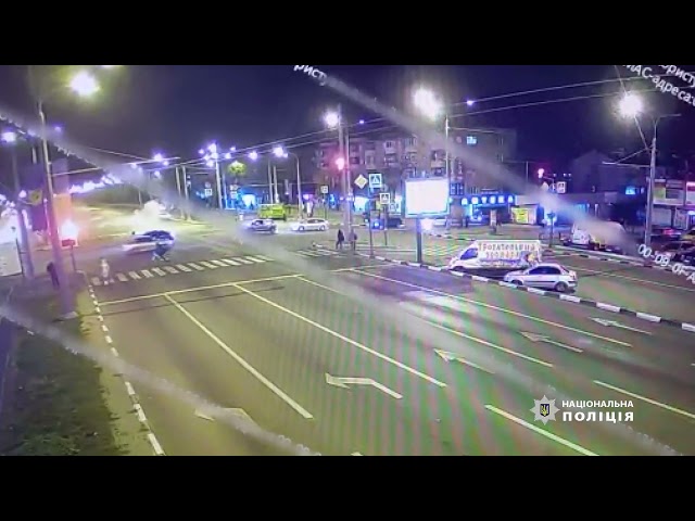 Нацполіція виклала також відео зіткнення, зняте камерами відеоспостереження із двох точок. Картина події ясна: автомобіль "Інфініті" на серйозній швидкості виїхав на перехрестя на червоне світло (на цей момент на "зелений" машини їхали вже кілька секунд) і зіткнувся з іншим авто - Chevrolet Aveo, просто знісши його з перехрестя. Водій машини, в яку врізався лихач, загинув, ще троє людей постраждали.