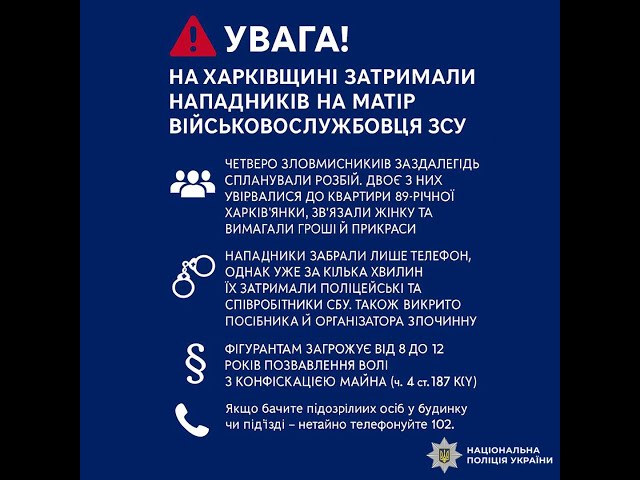 У Харкові правоохоронці затримали чотирьох учасників злочинної групи, які на 89-річну матір військового у її будинку. Зловмисники хотіли відібрати гроші та золоті прикраси у літньої жінки. Про це повідомили у Головному управлінні Національної поліції Харківщини.