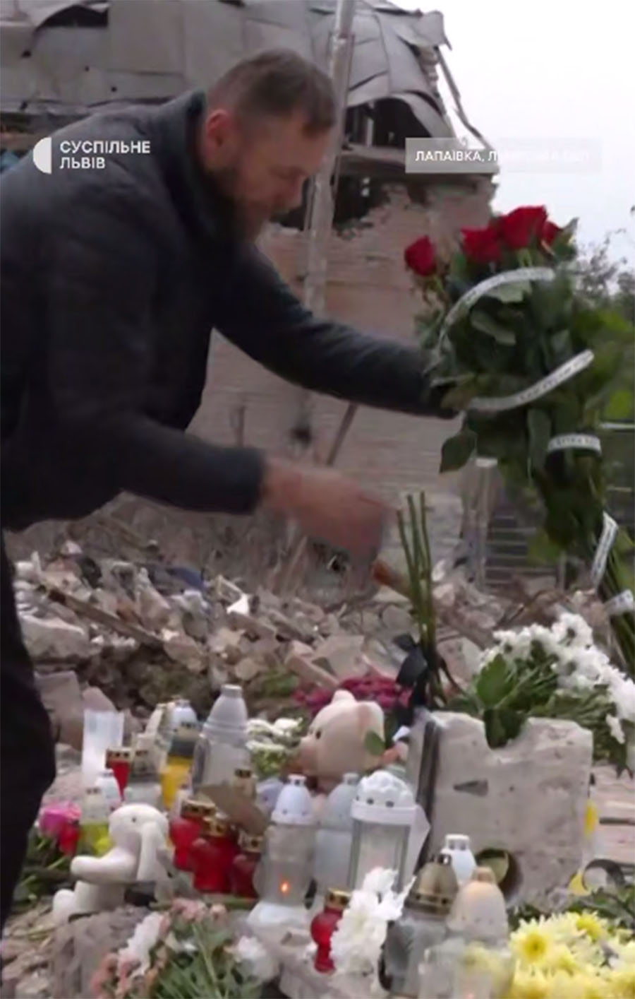 Володимир поклав квіти на руїни будинку, де загинула його донька. Фото: кадр з відео t.me/suspilnelviv