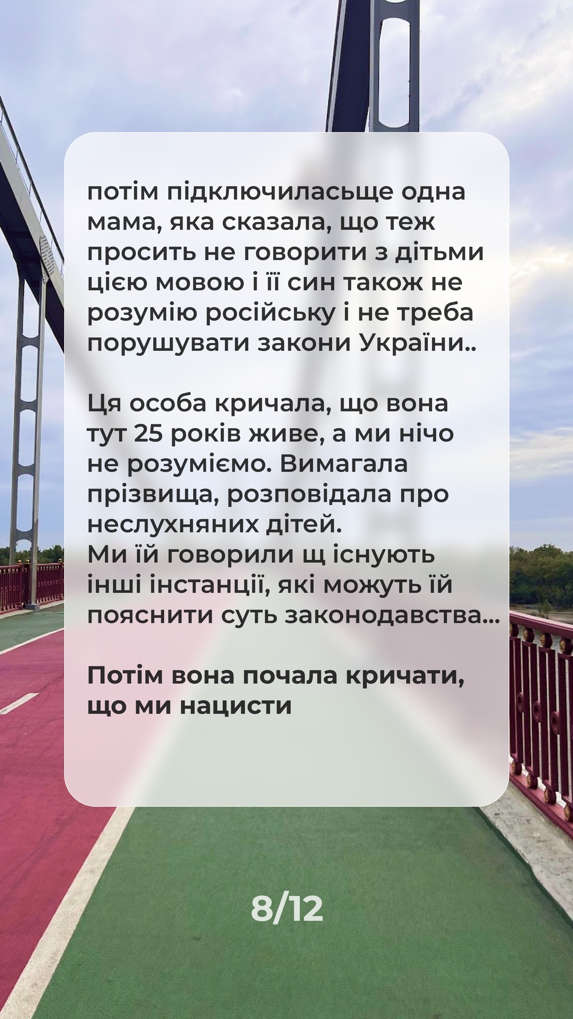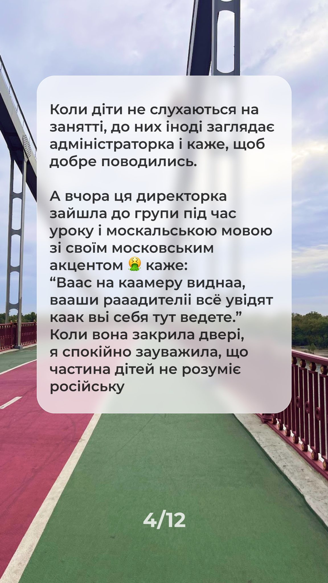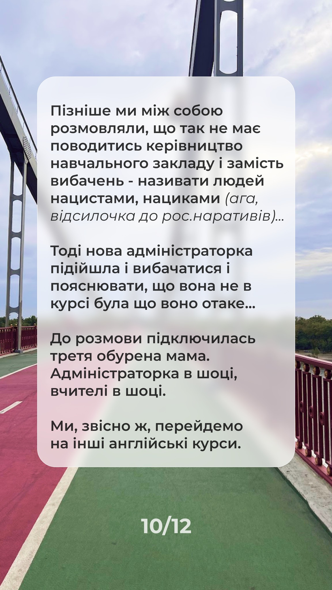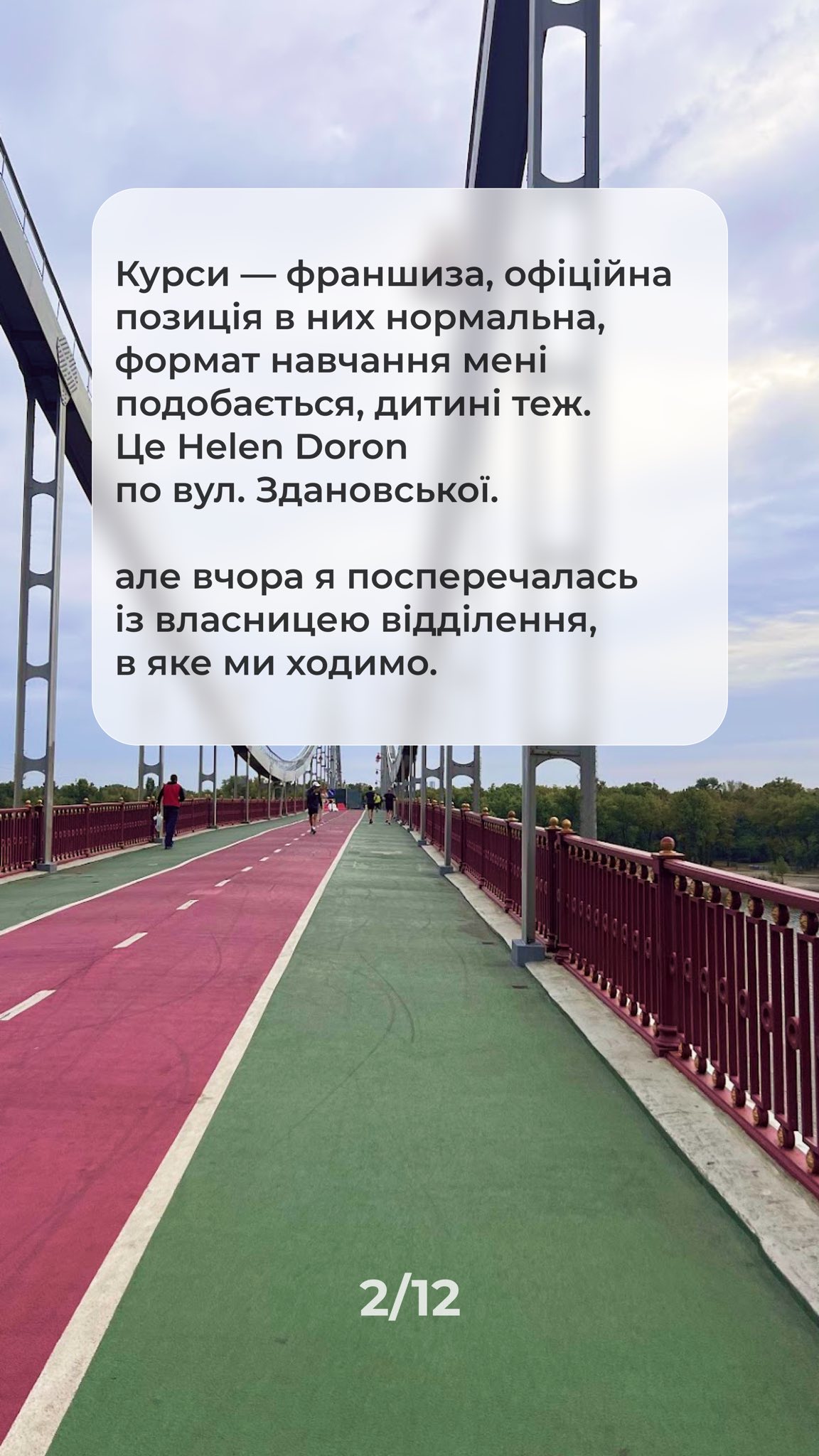 Декілька днів Олена Корусь – мама дитини, що навчається у школі – написала, що директорка спілкується з дітьми «російської мовою з московським акцентом» і що у відповідь на прохання розмовляти з учнями українською обізвала батьків «фашистами» і «нациками». Корусь наголосила, що була змушена звернутися до керівництва Helen Doron.