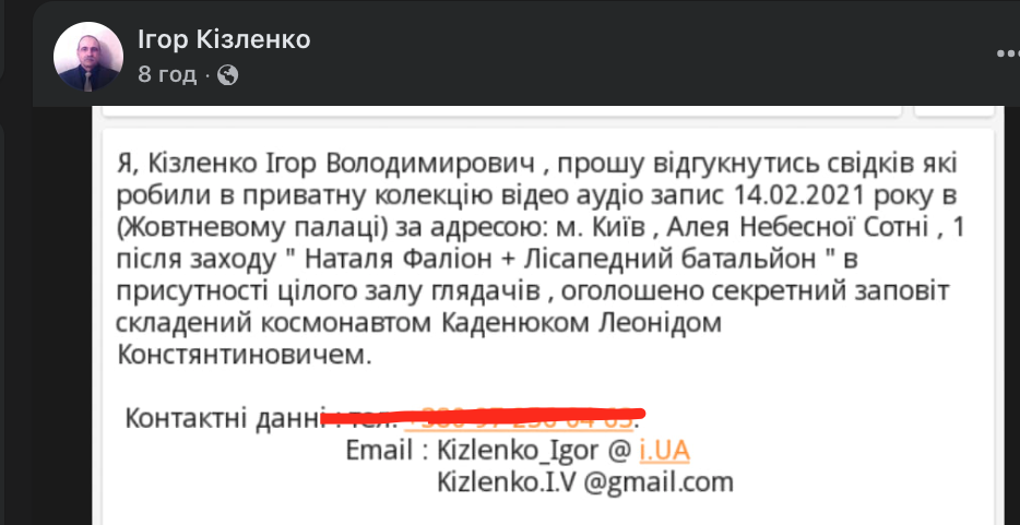 У фейсбуці ми знайшли сторінку чоловіка на ім’я Ігор Кізленко. В ній одне за одним дублюються оголошення з проханням відгукнутися свідків, які робили в приватну колекцію відео та аудіозаписи із заходу «Наталя Фаліон + Лісапедний батальйон» від 14.02.2021. Останнє було опубліковане в день смерті Дмитра Каденюка. Автор стверджує, що після концерту в лютому 2021 року у присутності повної зали глядачів був оголошений «секретний заповіт» Леоніда Каденюка. Ми подзвонили по вказаному номеру телефону, він виявився робочим. Розмова вийшла лаконічна: