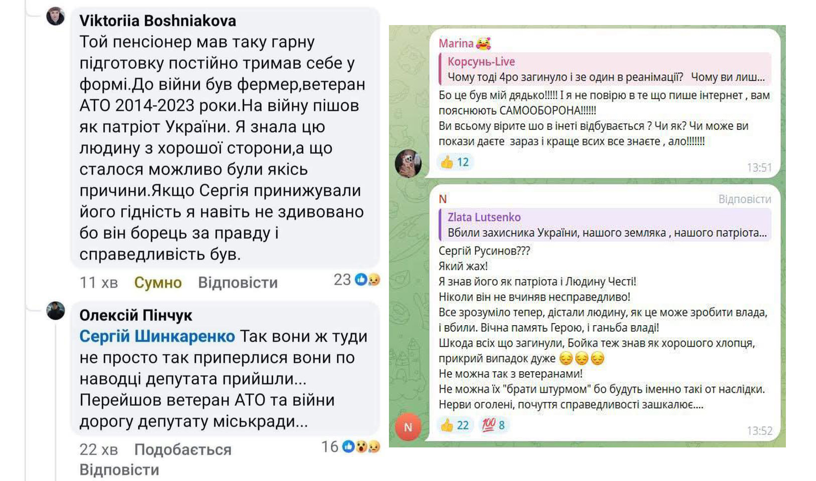 Конфлікт Русінова і Сторожука пов’язують із землею, на якій ветеран вів фермерське господарство до великої війни і після звільнення зі служби за станом здоров’я. Про загиблого згадують як про людину честі, патріота, правдоруба. «Ніколи він не вчиняв несправедливо. Все зрозуміло тепер, дістали людину… Не можна так з ветеранами, не можна їх брати «штурмом», бо будуть іменно такі наслідки», - йдеться в одному з коментарів.