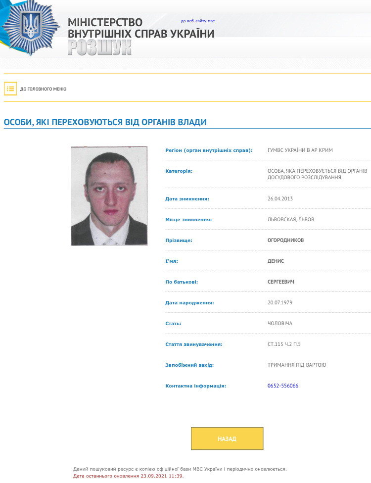 На той момент підозрюваний у вбивстві вже перебував у міжнародному розшуку. Картка на сайті МВС свідчила, що відносно Дениса Огороднікова 1979 року народження обрано запобіжний захід - арешт. Міліція перетрусила всі місця, де він міг перебувати в Криму і рідному Львові, але фігурант як розчинився. За однією з версій, він міг податися до Словаччини, проте і там не засвітився.