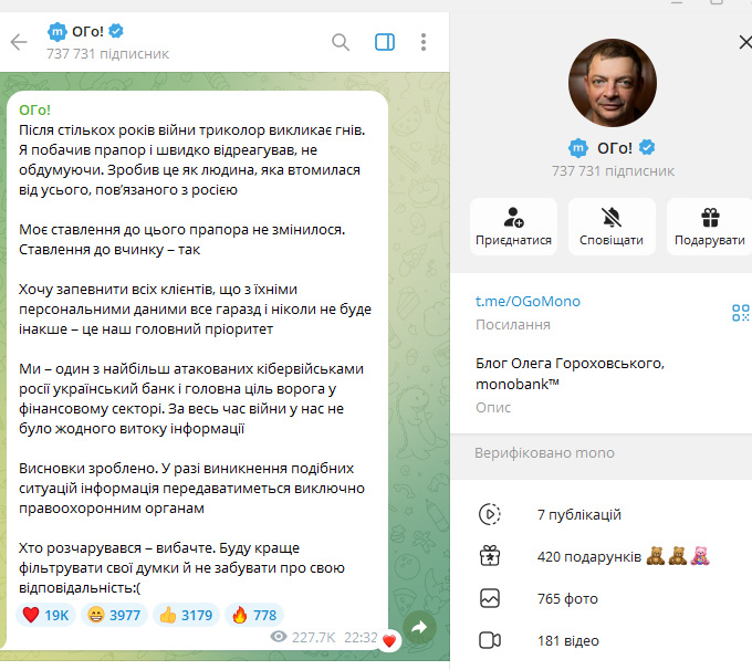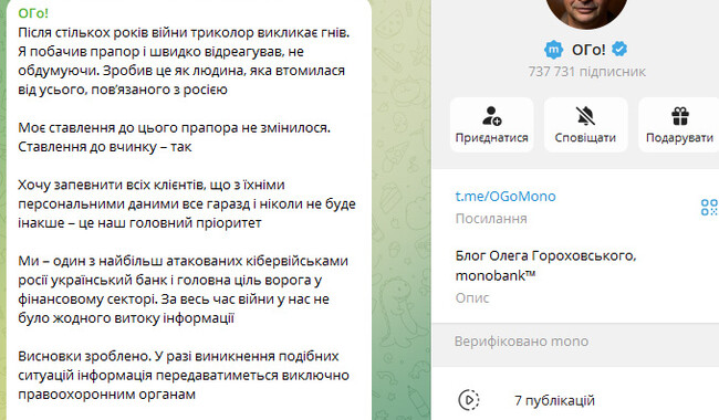 Співзасновник Monobank Олег Гороховський публічно вибачився за інцидент із розголошенням даних клієнтки та запевнив, що банківська таємниця залишається пріоритетом установи. Він запевнив клієнтів банку, що «з їхніми персональними даними все гаразд і ніколи не буде інакше – це головний пріоритет банку”.