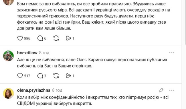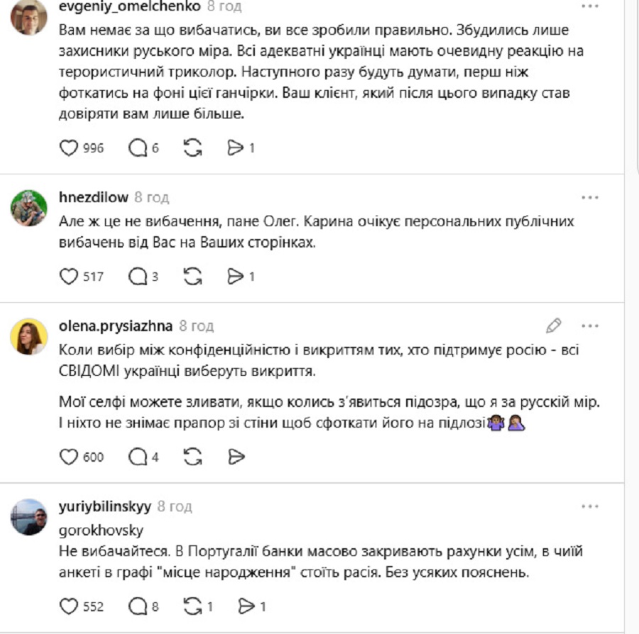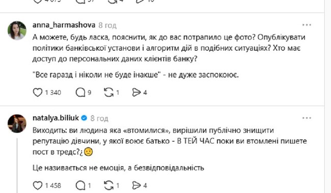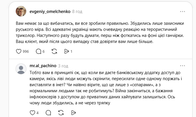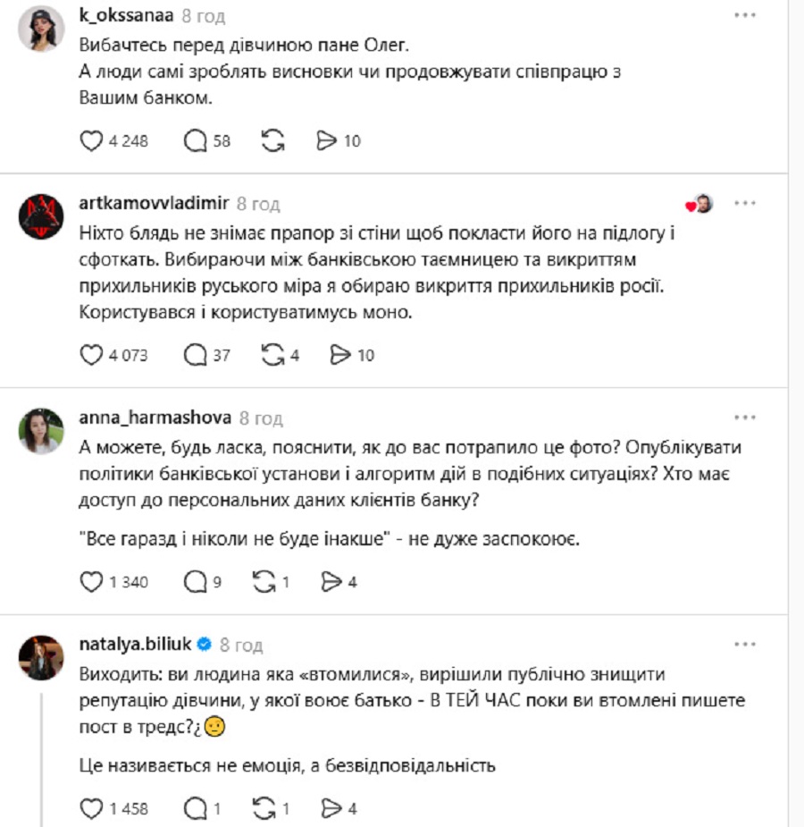 Думки користувачів розділились. Одні підтримали дії власника Монобанку, інші вимагають його особистого вибачення перед дівчиною. «Вибираючи між банківською таємницею та викриттям прихильників руського міра я обираю викриття прихильників росії», «Виходить: ви людина яка «втомилися», вирішили публічно знищити репутацію дівчини, у якої воює батько - В ТЕЙ ЧАС поки ви втомлені пишете пост в тредс? Це називається не емоція, а безвідповідальність», «Ви все зробили правильно. Збудились лише захисники руського міра. Всі адекватні українці мають очевидну реакцію на терористичний триколор. Наступного разу будуть думати, перш ніж фоткатись на фоні цієї ганчірки», - пишуть вони.