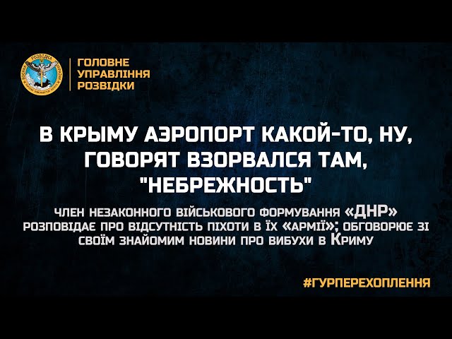 Українська розвідка опублікувала перехоплення розмови російських окупантів із Донецької області, які говорили про вибухи на аеродромі у Криму. Про це повідомляє Головне управління розвідки Міністерства оборони України у Telegram.