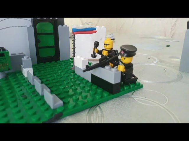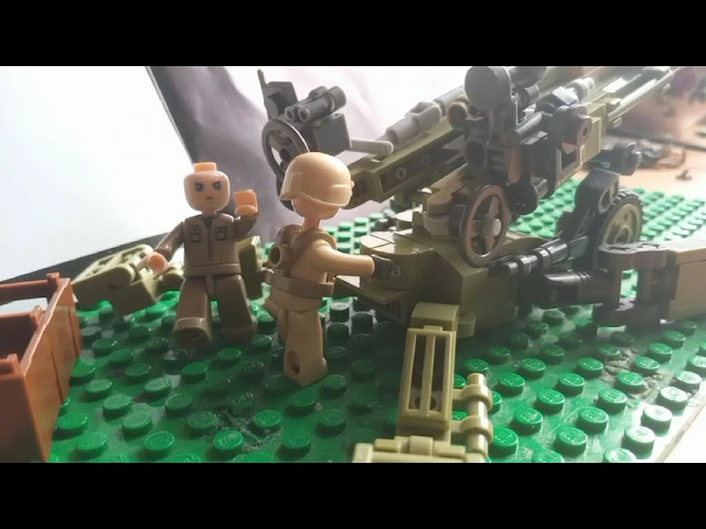 По українському зеленому полю сунеться ворожий російський танк, зібраний з "Лего". Водночас пластмасові українські військові заряджають гаубицю М-777, яка стріляє та зносить на ворожій техніці башту.