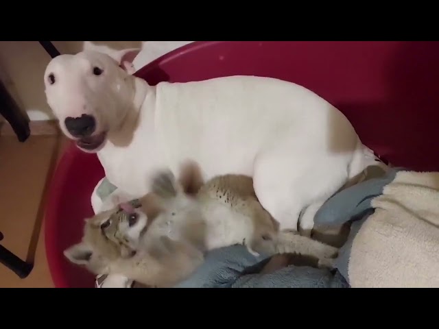 Собаки жили вдома у дівчат і були їхніми домашніми улюбленцями, тому компанію малюк собі не обирав, але швидко потоваришував із бультер'єрами. Вони теж прийняли його як свого і тепер із радістю граються з ним, зображають поєдинки і навіть дозволяють кусати себе за хвости.