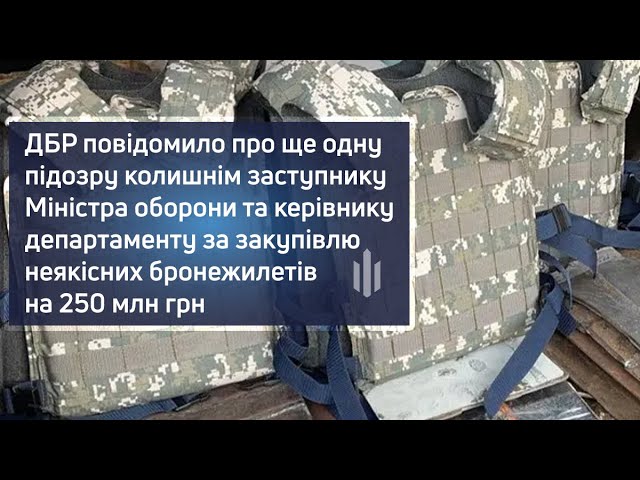 Державне бюро розслідувань (ДБР) повідомило про підозру колишнім заступнику міністра оборони України В’ячеславу Шаповалову та керівнику одного з департаментів МОУ за розтрату понад 250 млн грн державних коштів, виділених на закупівлю бронежилетів. Як повідомили в пресслужбі ДБР, це ще один епізод викритих незаконних оборудок експосадовців, загальний обсяг яких складає 1,4 млрд гривень.
