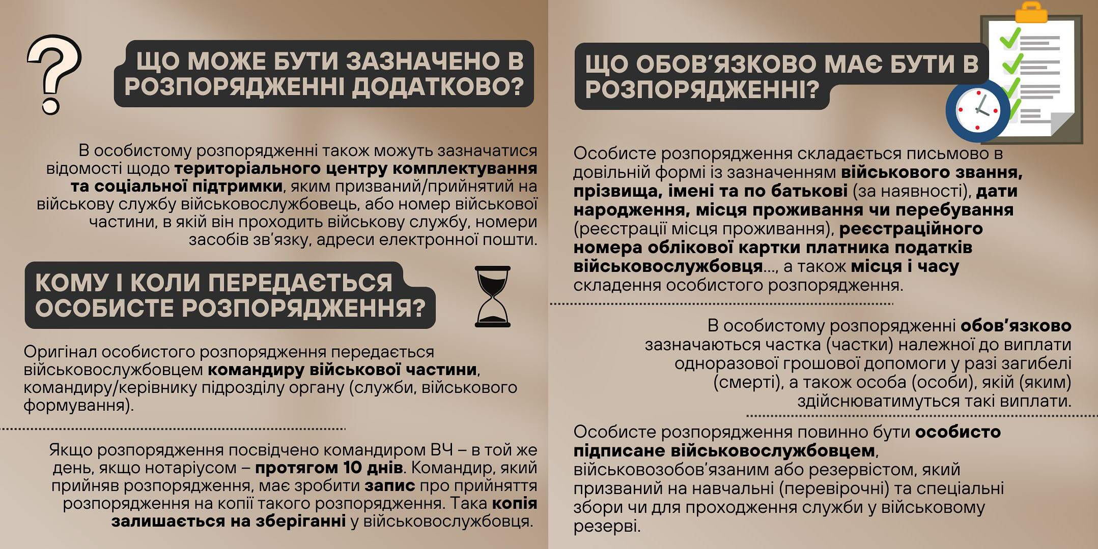 Що має бути вказано і ким завірено в особистому розпорядженні військовослужбовця. Інфографіка: іnstagram.com/natalia.sabatiuk