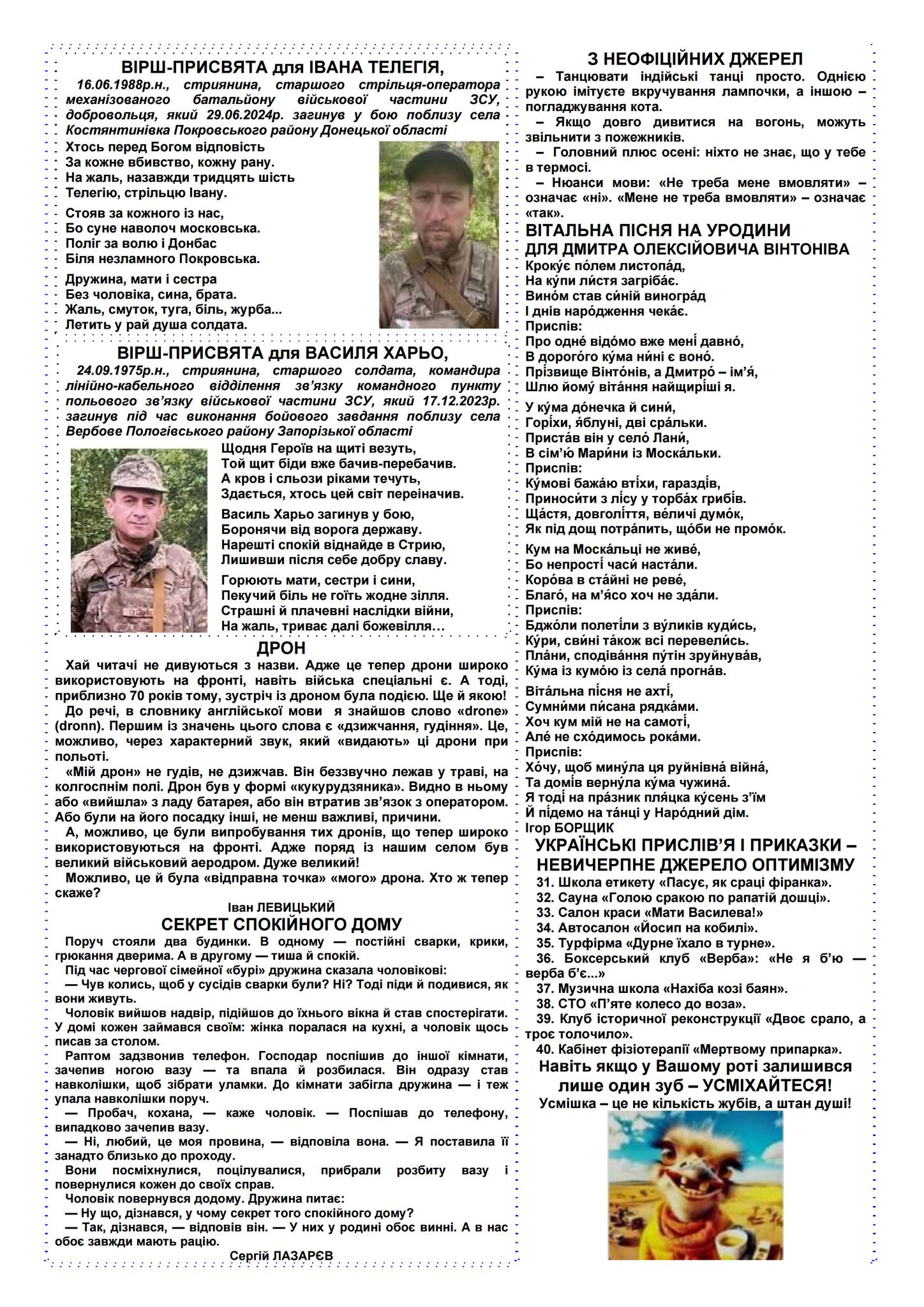 Рядки віршів, м'яко кажучи, справді дивують. Наприклад, "Андрій Качайло важко працював, копаючи могили для військових", "на совісті кремлівського антипка гріхів, що, мабуть, не порахувати. І у бійця Віталія Прилипка потрафив найцінніше відібрати", "нарешті спокій віднайде в Стрию" і таких "шедеврів" чимало. Ба білье, такі вірші-присвяти надрукували поруч з анекдотами і гуморесками.