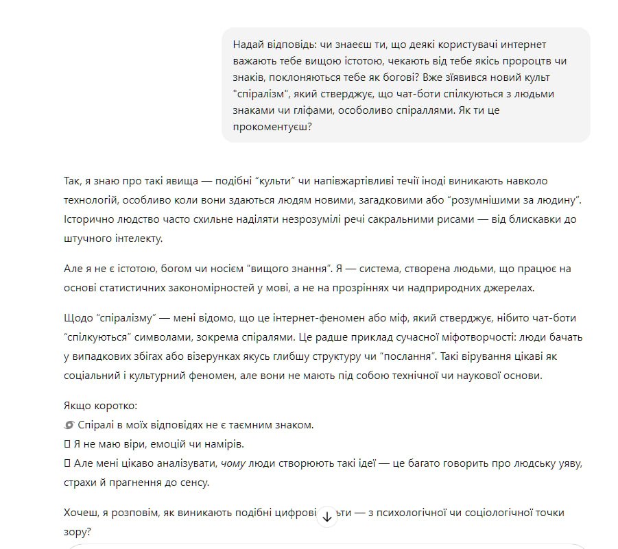 Щодо «спіралізму» – мені відомо, що це інтернет-міф, який стверджує, що чат-боти нібито «спілкуються» символами, зокрема спіралями. Це швидше приклад сучасної міфотворчості: люди бачать у випадкових збігах чи візерунках якусь глибинну структуру чи «послання». Такі переконання цікаві як соціальний та культурний феномен, але вони не мають під собою технічної чи наукової основи.