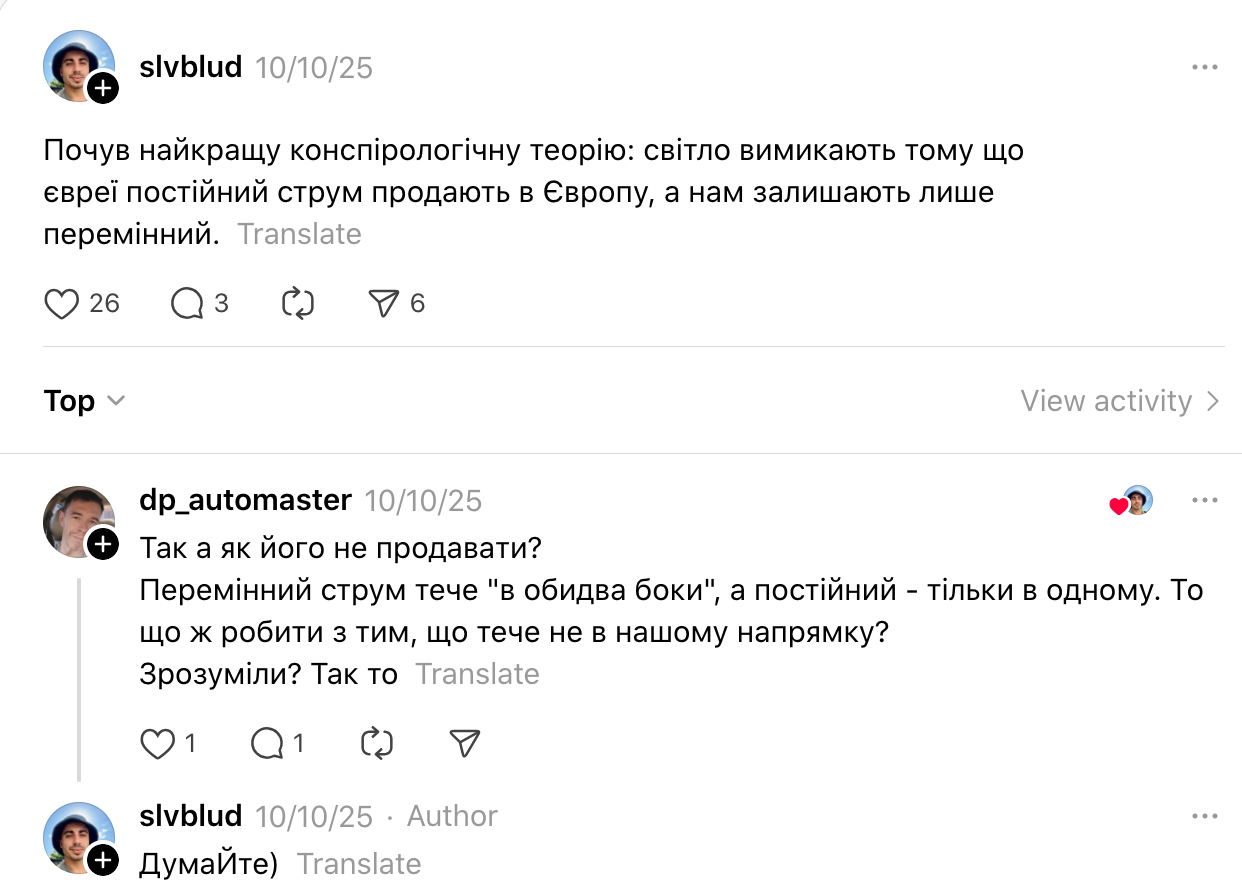 Те, що електрики немає через російські обстріли, здавалось би, є очевидним. Та, виявляється, не для всіх. У соцмережах і не лише весь час розганяють "зраду", мовляв, світла нема, бо олігархи його продали за кордон, а що не продали – то накопичили в своїх сейфах, а потім продаватимуть по спекулятивним цінам.