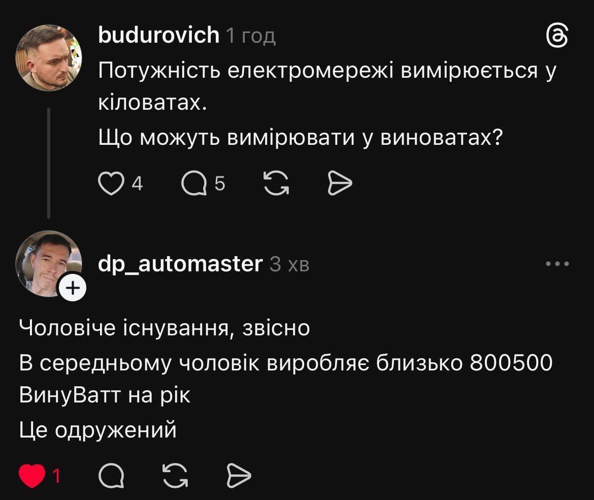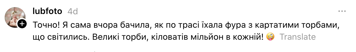 Їхала по дорозі поблизу Львова, раптом бачу - по правій полосі йдуть двадцять фур і всі яскраво світяться. Я зупинилась і у місцевого діда спитала, що везуть. А він каже: "Це тут часто буває, це електрику везуть продавать в Європу. Фури світяться, вночі спать мішають". (с) Alina Sarnatska