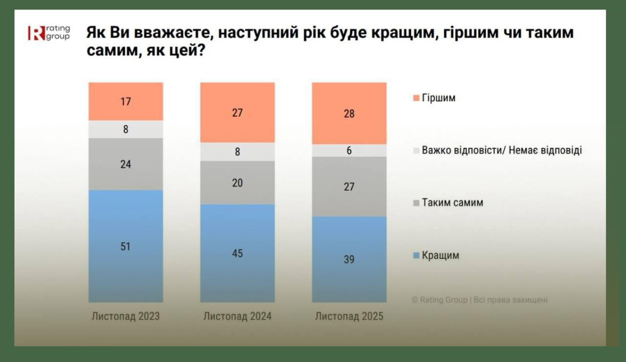Зазначається, що 27% опитаних українців вважає, що у 2026 році нічого не зміниться, у 2024 році так думали 20% громадян. Водночас кожен четвертий респондент (28%) вважає, що наступний рік буде гіршим.