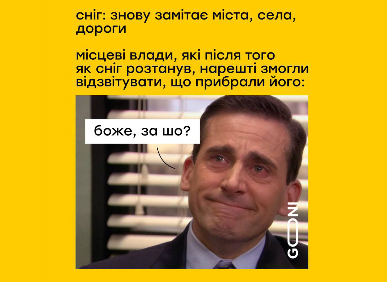 Скоро вже кінець цієї непростої зими. До весни залишився тиждень, і щоб прожити ці останні 7-8 днів зими, нам потрібна енергія. Пропонуємо завантажувати цю енергію прямо з наших мемів. А ось тут – великий павербанк гумору за декілька років.
