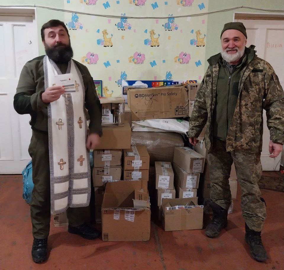 У важких обставинах побратими стають один для одного першими психологами. Допомагають підтримувати дух бійців і капеллани. Із батьком Миколою Подужайлом. Фото: надане Русланом Добровольським