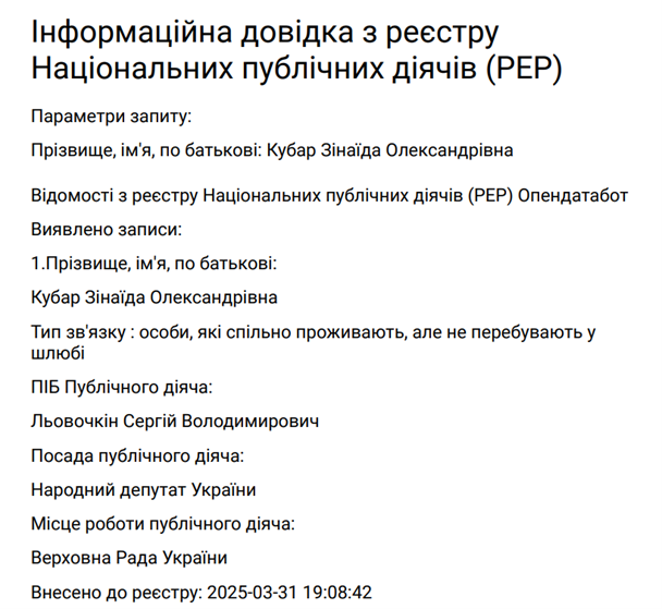 Ще у 2025 році ім’я Зінаїди Кубар офіційно значилось в реєстрі Національних публічних діячів (PEP»). Бо якщо жила із політиком - ласкаво просимо до світу фінансової дисципліни і прозорості.