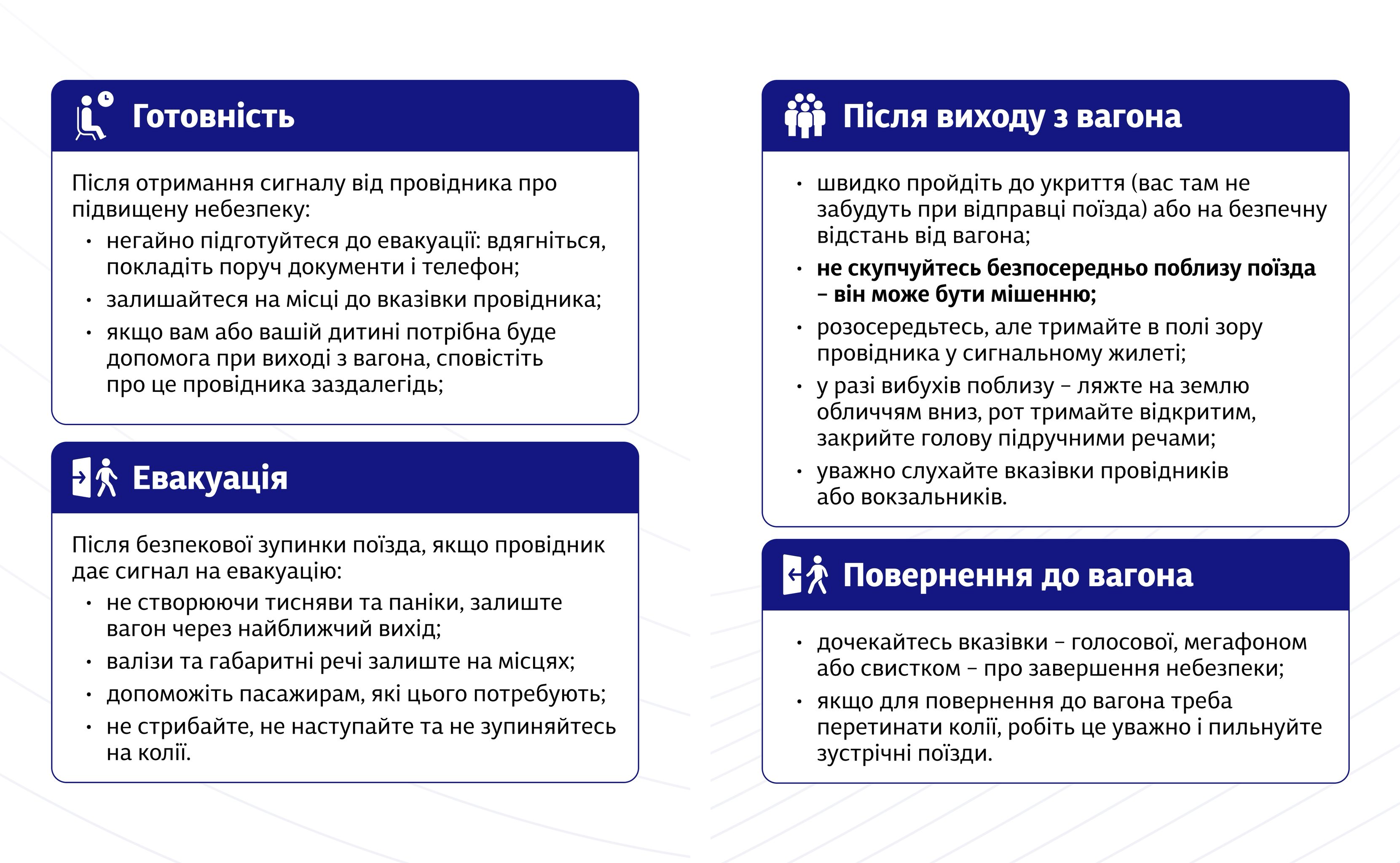 • до сигналу провідника пасажири залишаються на своїх місцях, не створюють скупчення у проході чи тамбурі вагону,