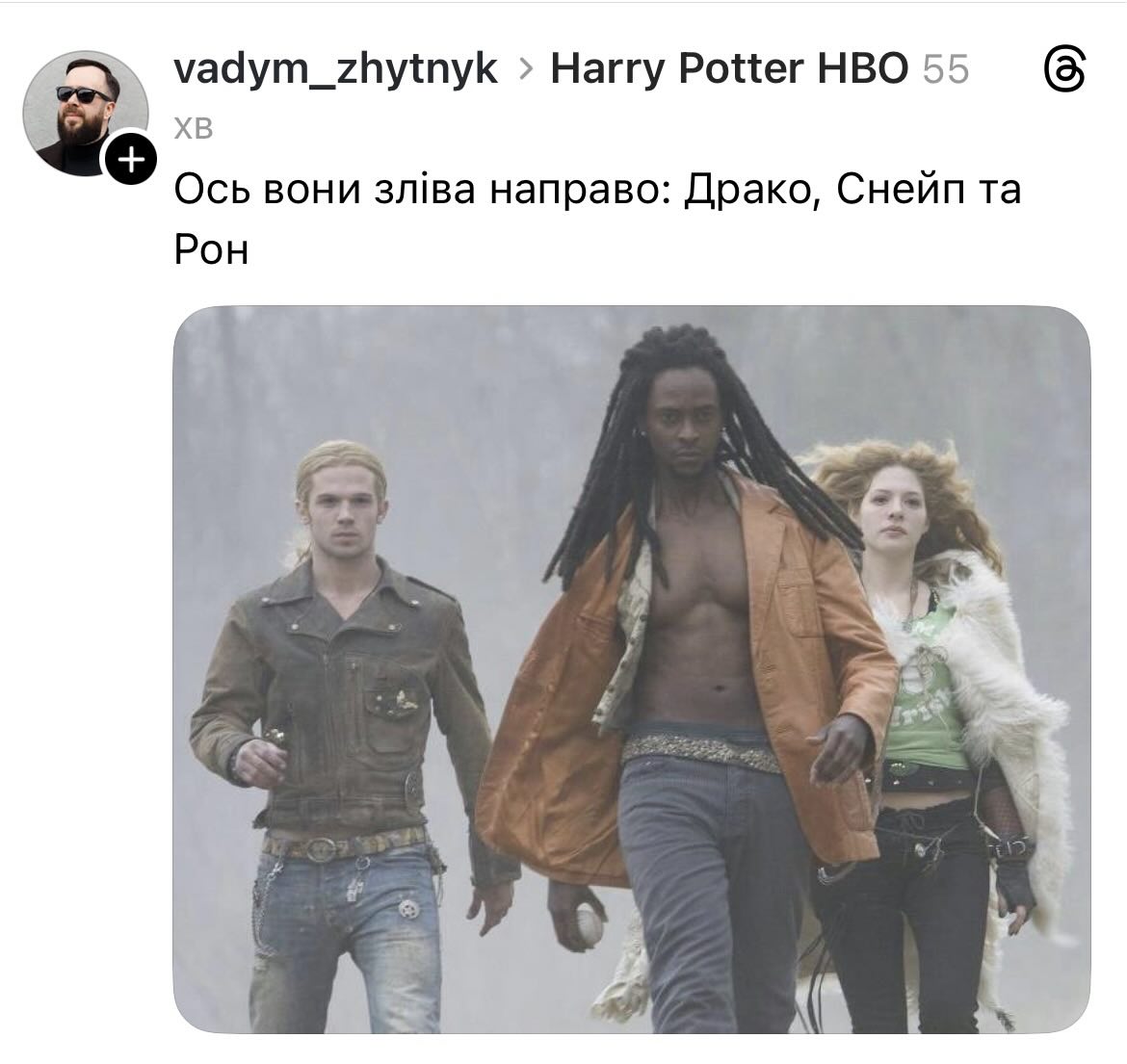 Це тепер виходить, що Гаррі і його друзі будуть расистами в новому серіалі, бо в усіх бідах будуть підозрювати Снейпа? (с) Ліка Коваленко