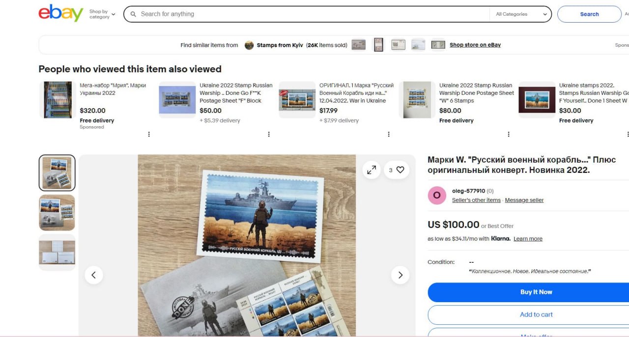 Цю марку, як і інші серії («Російський військовий корабель… Все» та «Все! Слава Нації!») можна знайти у продажу на міжнародних аукціонах, таких як eBay, та інших торгових майданчиках.
