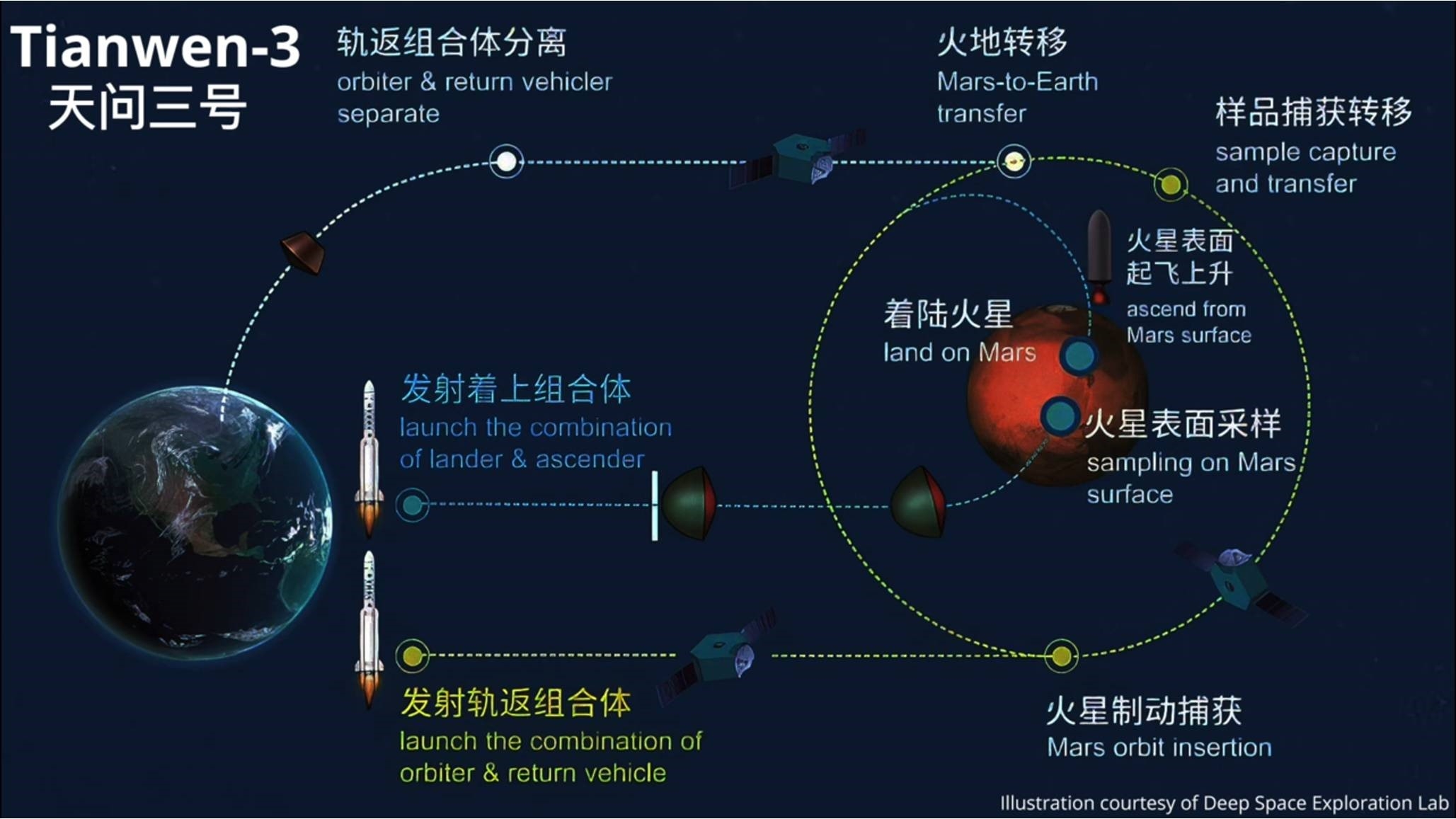 🚀Місія з доставки зразків із Марса (2028–2031 рр.). Китай планує відправити автоматичну місію на Марс із завданням взяти зразки ґрунту і доставити їх на Землю. Це вкрай складна операція, що включає зліт із поверхні Марса і стикування на орбіті.