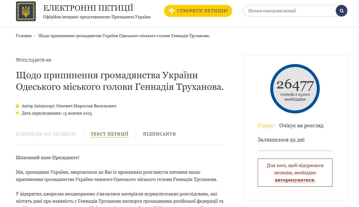 Петиція із закликом припинити громадянство Одеського міського голови Геннадія Труханова зібрала понад 25 тисяч підписів, необхідних для розгляду главою держави.