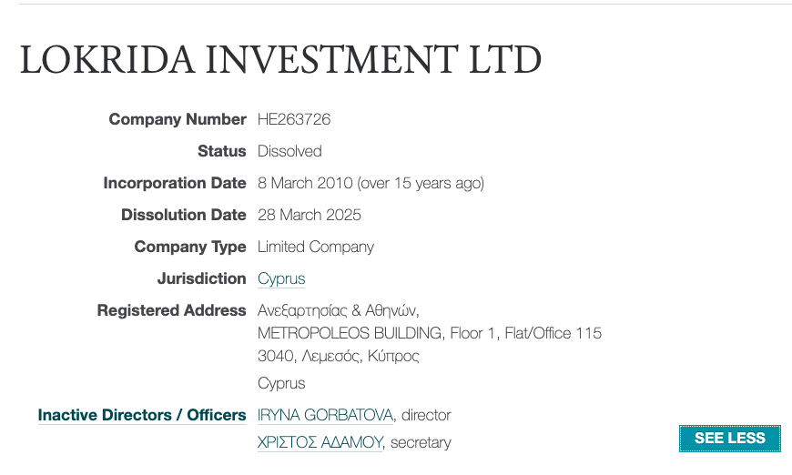 Згадана Lokrida Investment також виступає в Україні бенефіціаром обʼєднання співвласників багатоквартирного будинку “Братська-8” спільно з іншою кіпрською компанією Ірини Горбатової - Thetopinact LTD (HE241450). Остання також контролює ТОВ “ММХ” (20795680), що здає в оренду нерухомість в Трускавці Львівської області.
