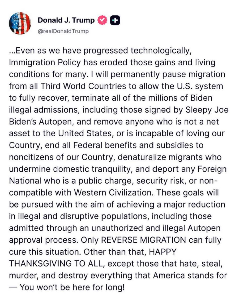 Більше того, Трамп також пообіцяв скасувати «мільйони незаконних допусків Байдена» і припинити всі федеральні пільги та субсидії для негромадян. Президент США також планує: позбавити громадянства мігрантів, які «підривають внутрішній спокій» і депортувати всіх іноземних громадян, які є «тягарем для суспільства, загрозою безпеці або несумісні із західною цивілізацією».