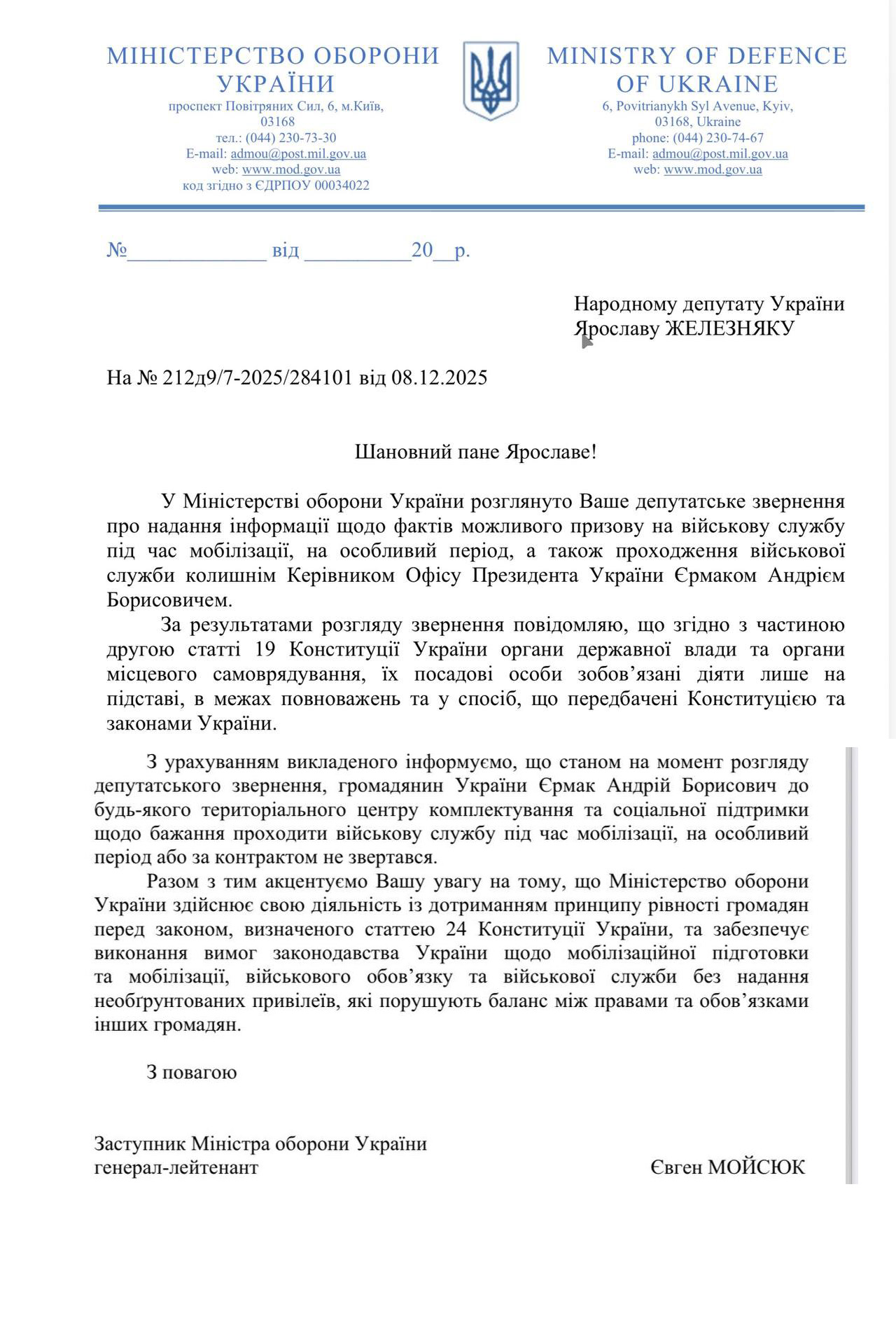 Він оприлюднив лист-відповідь Міноборони від 8 грудня 2025 року. Згідно з ним Єрмак на той момент «до будь-якого ТРК та СП щодо бажання проходити військову службу під час мобілізації… не звертався».