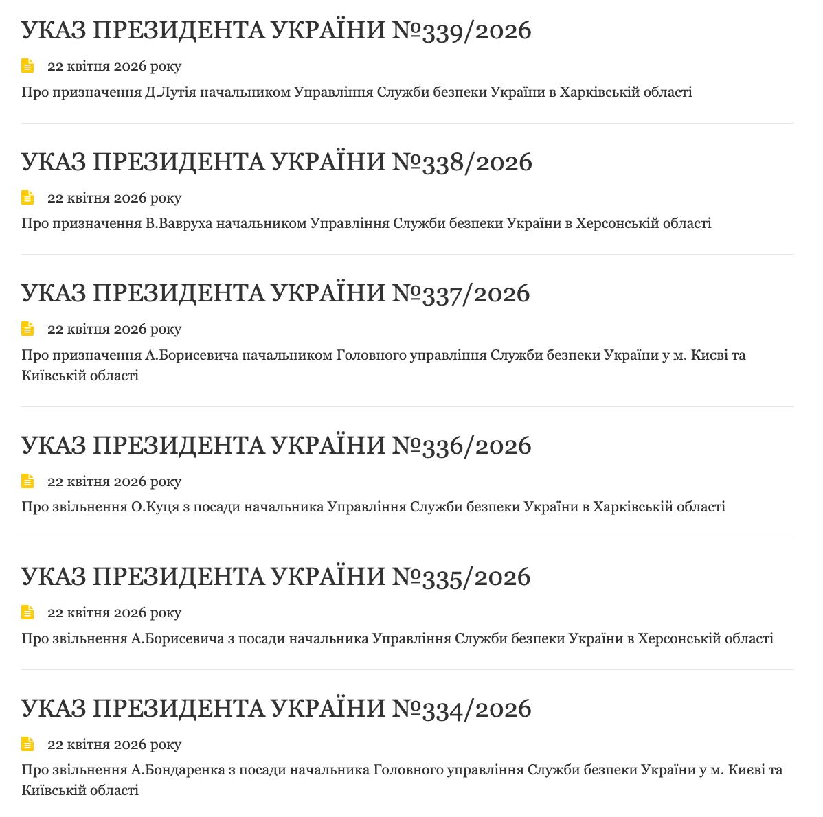 Згідно з опублікованими 23 квітня указами, звільнено начальника Головного управління СБУ у м. Києві та Київській області Артема Бондаренка. На цю посаду призначено Артема Борисевича.