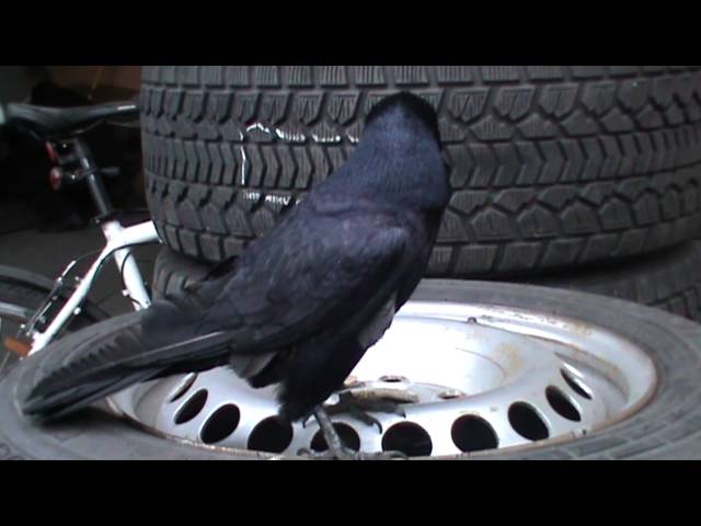 Ворона пытается откручивать гайки с колес, чистит бамперы от камешков и собирает на асфальте разбросанные проводки.
