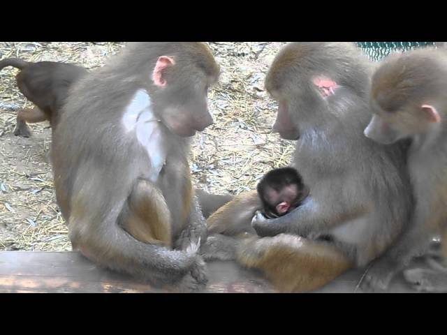 Семья павианов гамадрилов практически весь день сидит, окружив самку, которая держит в лапах недавно родившегося детеныша. Каждый член стаи хочет потрогать малыша, поиграть с ним. Но мама довольно строго пресекает все попытки дотронуться до крохи. Рычит на своих сородичей, а иногда и оплеухи раздает особо настырным.